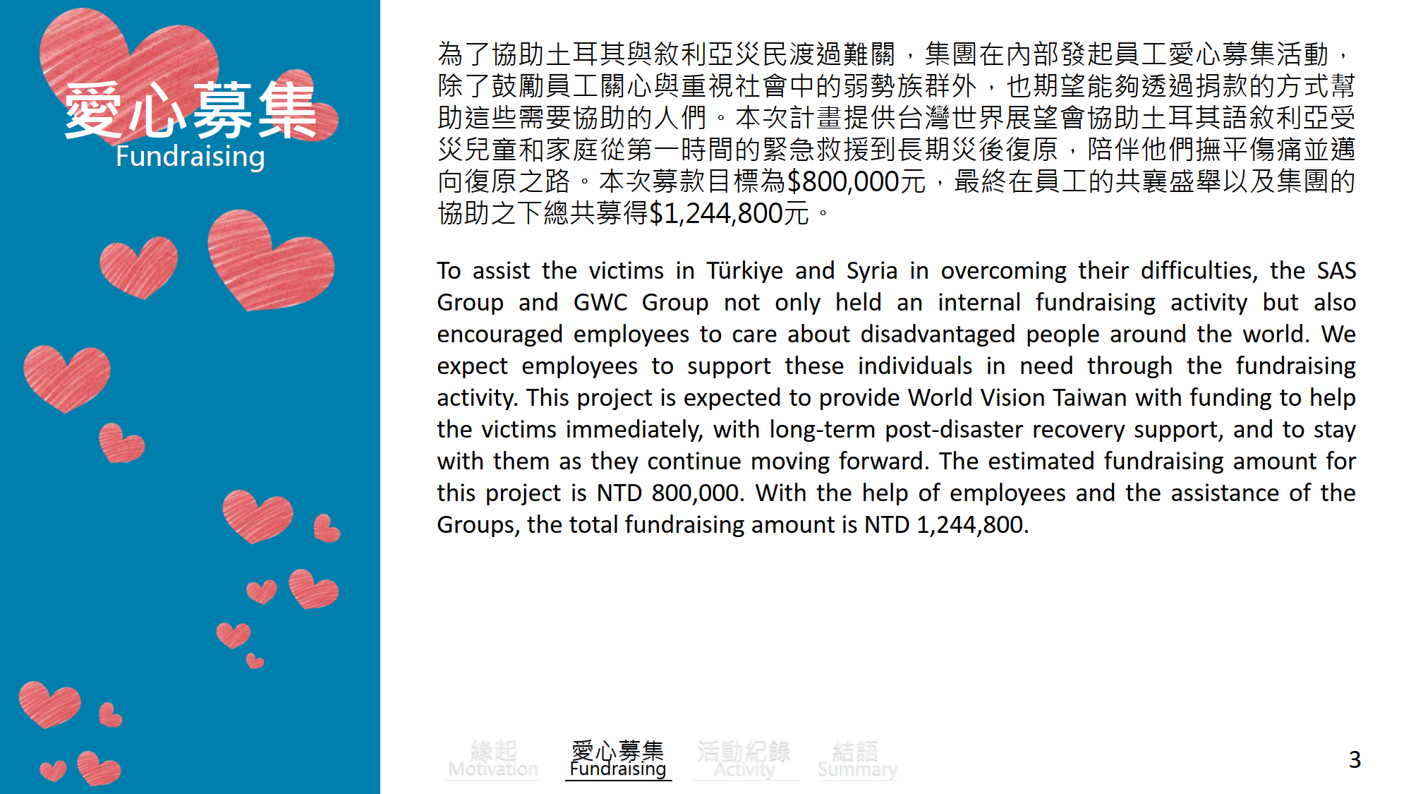• Our subsidiary, Sustainable Sunrise Co., Ltd., received the Silver Award in the Ministry of Health and Welfare’s Healthy Workplace Benchmark Award