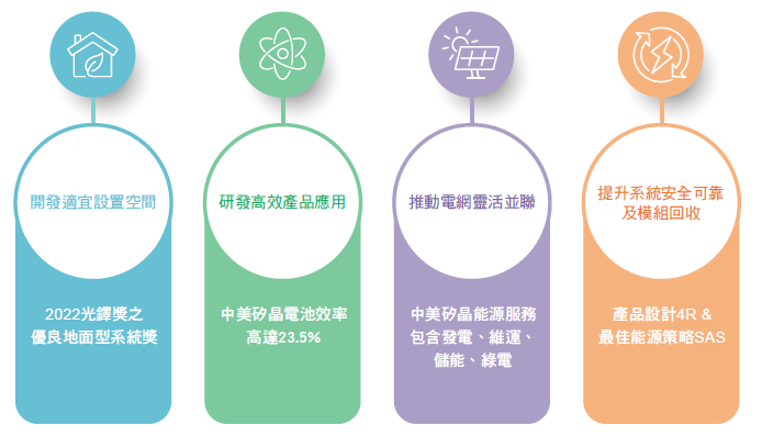 中美矽晶秉持著高轉換效率電池生產,不斷創新研發高效率產品。中美矽晶藉由上下游供應鏈整合,於產品技術上,透過技術交流,快速整合上下游技術開發能力,縮短新產品上市時程,提升產品可靠度,增加品質信心水準,更有效率的提升產品貼近於終端使用需求。品質方面,中美矽晶從顧客資訊收集,產品設計開發,生產製作流程,都有嚴謹的程序流程進行把關,藉由各階段系統性管理,提供卓越與穩定產品品質。針對產品持續改善,中美矽晶定期召開生產晨會、營運週會、品質月會、管理審查會議、每年年度檢討會議等改善會議,不斷進行PDCA,提升產品與服務,降低成本開銷,進而回饋社會。