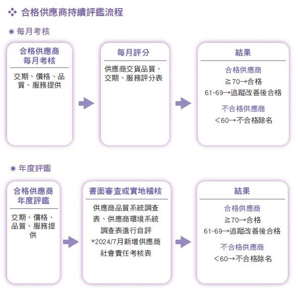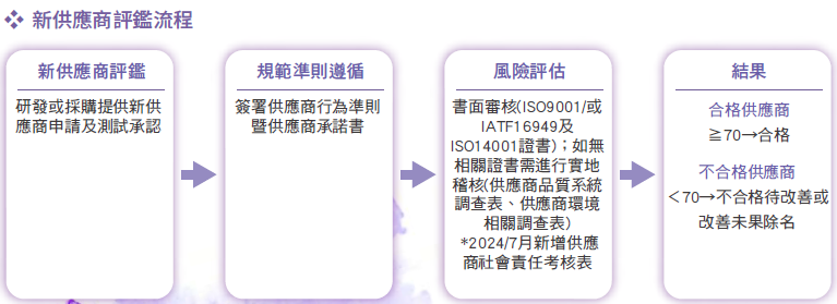 - 社會責任 : 供應商是否遵循公平勞工準則、無強迫勞動及無童工的要求、無使用衝突礦產並致力於遵循「責任商業聯盟行為準則RBA」規範。
