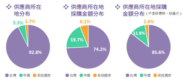 於2024 年竹南分公司、宜蘭分公司及旭鑫分公司,供應商總計545 家,在地化廠商507 家佔比92.8%,其採購金額佔總採購金額74.2%。而中美矽晶未使用衝突礦產,其中對日常營運影響較大之關鍵原物料為矽原料、摻雜劑、矽晶片、導電漿,受限於地緣與經濟規模影響,無法全數由台灣取得,倘若不將矽原料與矽晶片納入採購金額統計,在地採購金額約佔總採購金額( 不含矽原料、矽晶片) 之85.6%。