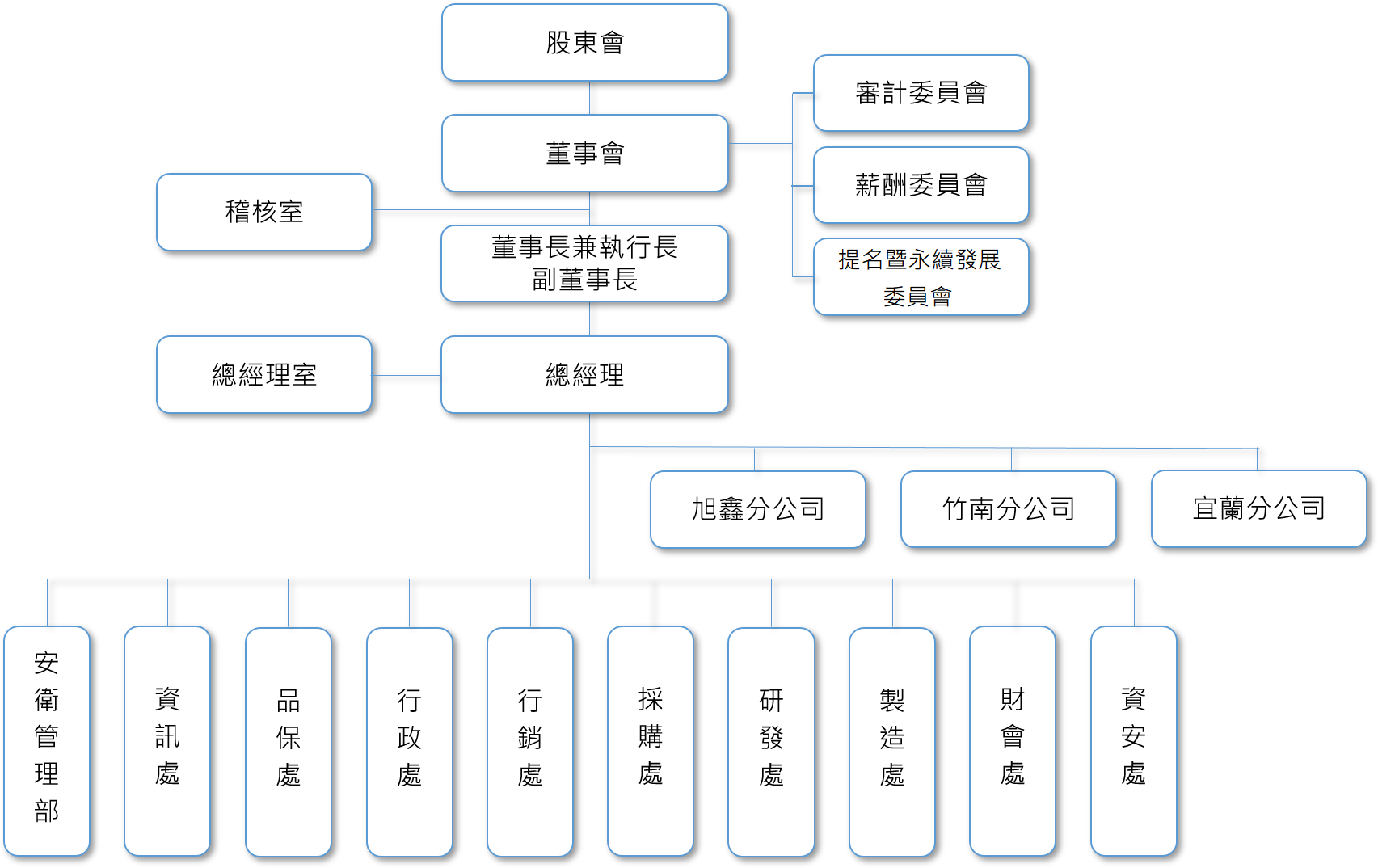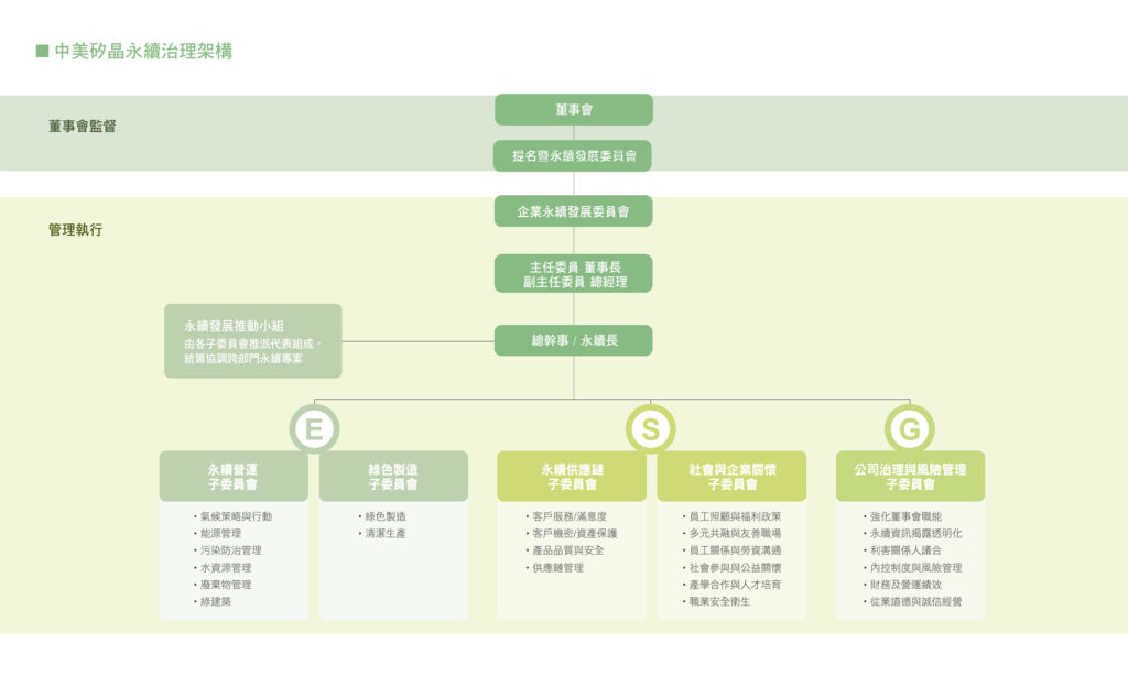 企業永續發展委員會由董事長擔任主任委員,總經理擔任副主任委員,並設置總幹事,負責統籌委員會相關事務。另設永續長一人,由董事會委任。