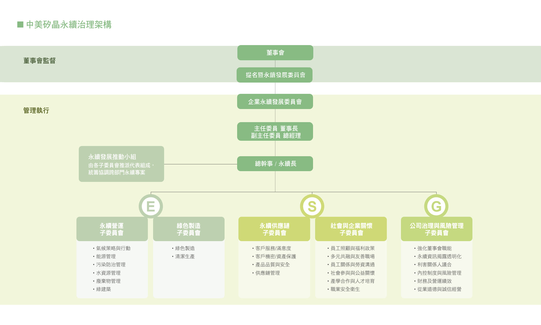 企業永續發展委員會依據業務功能設置五個子委員會,包括「永續營運子委員會」、「綠色製造子委員會」、「永續供應鏈子委員會」、「社會與企業關懷子委員會」、「公司治理與風險管理子委員會」,由各單位主管所組成,負責策略及管理方針之擬定,確保永續發展策略充份落實於公司日常營運中。「企業永續發展委員會」另設「永續發展推動小組」,擔任上下整合、橫向串聯的跨部門溝通平台,並且藉由定期舉辦工作會議,或依各項ESG專案而設之任務小組,就相關議題進行跨部門整合及執行推動,並定期追蹤執行成效及持續改善。企業永續發展委員會每年召開全員會議,針對本公司重大永續議題檢討當年度目標達成情形,並檢視短、中、長期目標之設定。