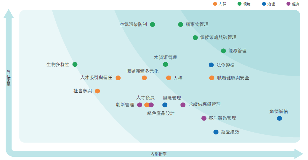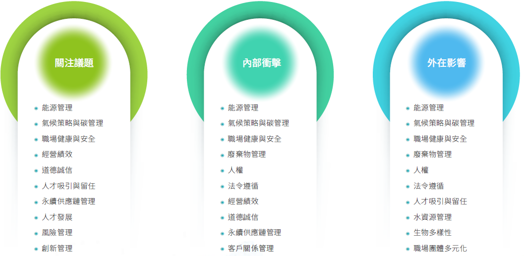 | 員工 | 員工為公司最重要的資產,唯有照顧好員工,兩者才能同步成長。 | 內部網站及電子郵件 | 不定期 | 1. 人才吸引與留任 2. 人才發展 3. 職場健康與安全 |